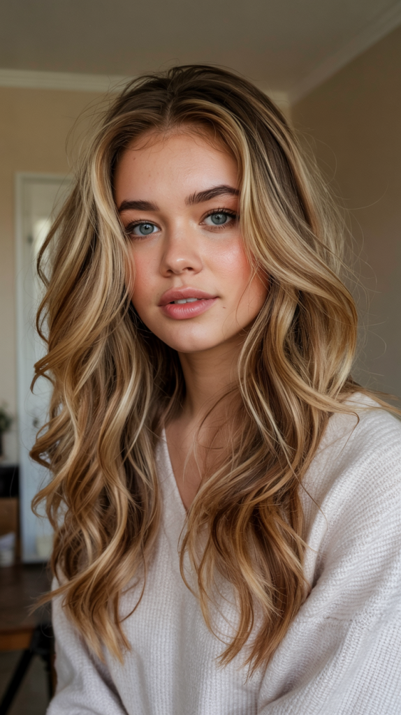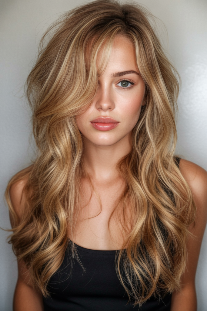 Golden and strawberry blend into this soft sandy strawberry blonde, the very incarnation of a natural type of beauty, this strawberry blonde can be completed into a beautiful sun-kissed result. The soft beachy waves make it look less dressy and the slightly lighter layers framing the face add more light to the complexion.