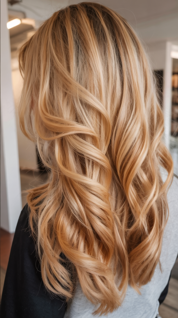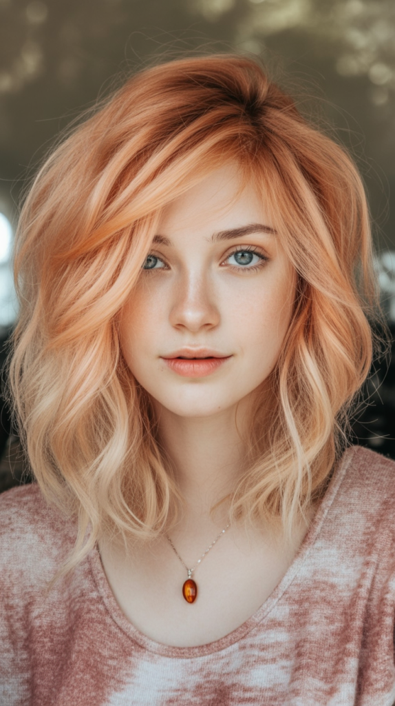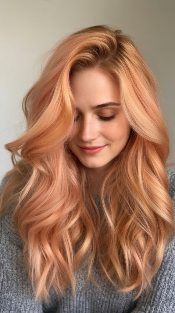 The soft peachy tones blending to strawberry blonde in this style would serve them right as a dream to anyone who is enamored with romantic, feminine-looking qualities. The color is pale, but deep, like candle-light on the skin. Airy waves and not very structured curls endow it with the modern softness that does not feel too strong and too much, but rather cool and young.