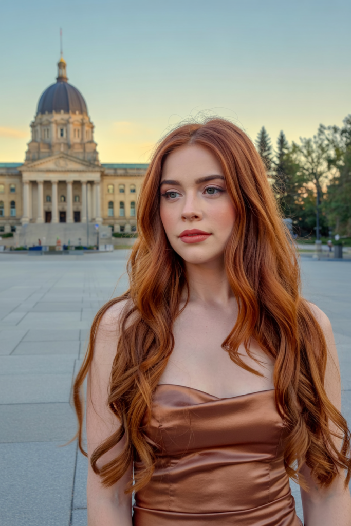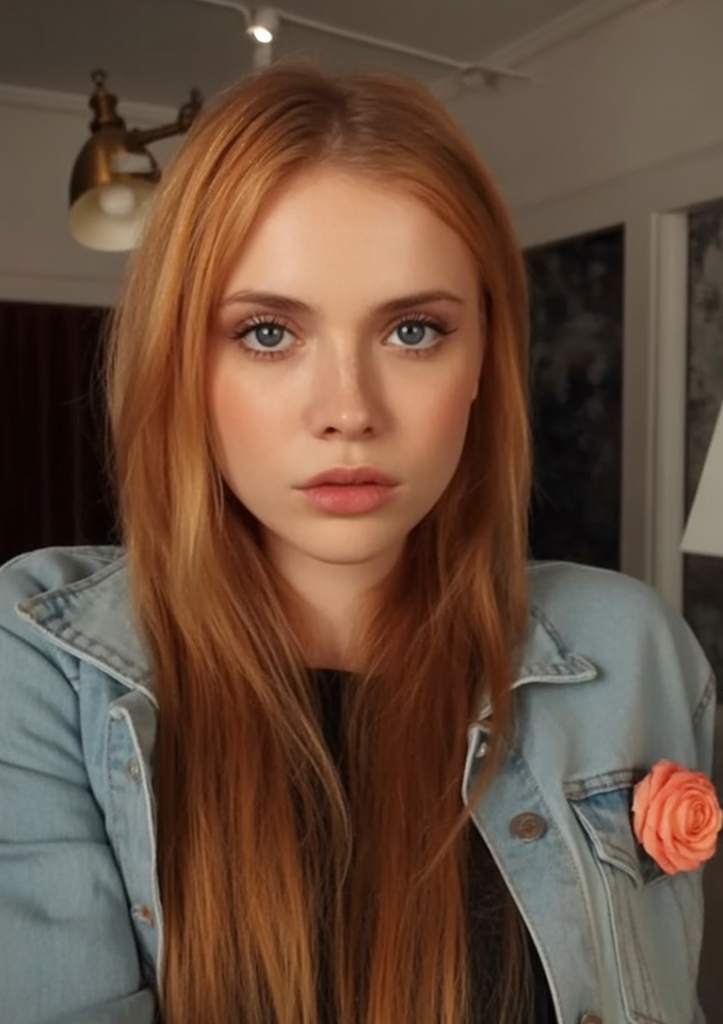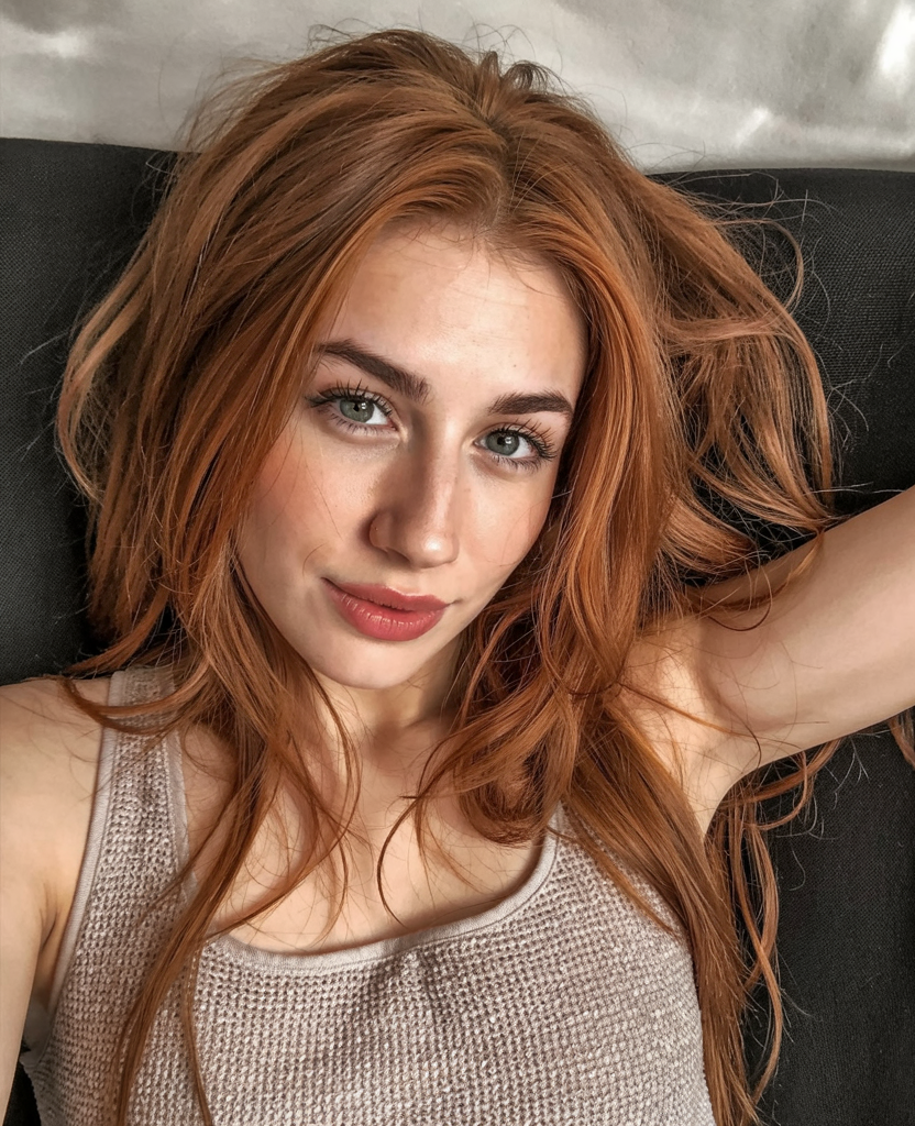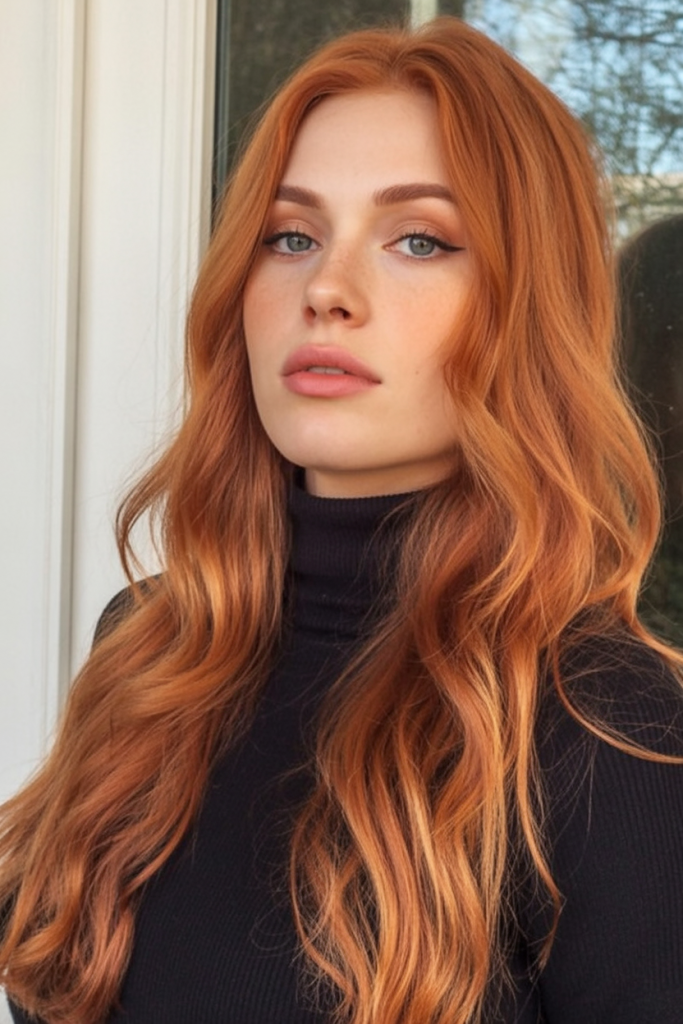It is a dark copper colored strawberry blonde with warm confidence and a hint of hypnotic glamour to the deep golden-red tones. The length and the soft waves are layered on the face to create the design, which is bold yet elegant at the same time. It is a shade that makes the eyes simply piercing to look at.