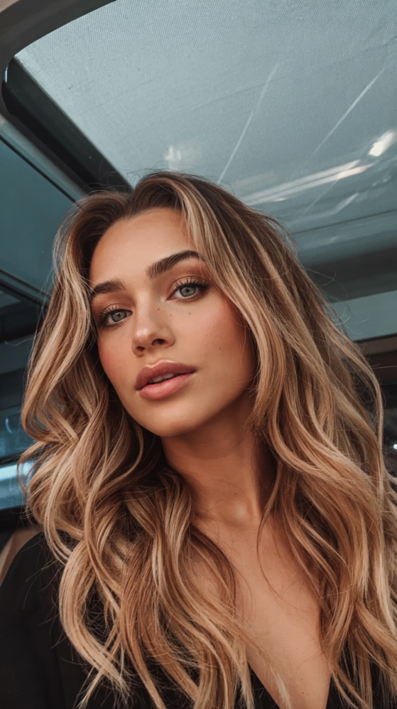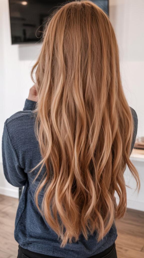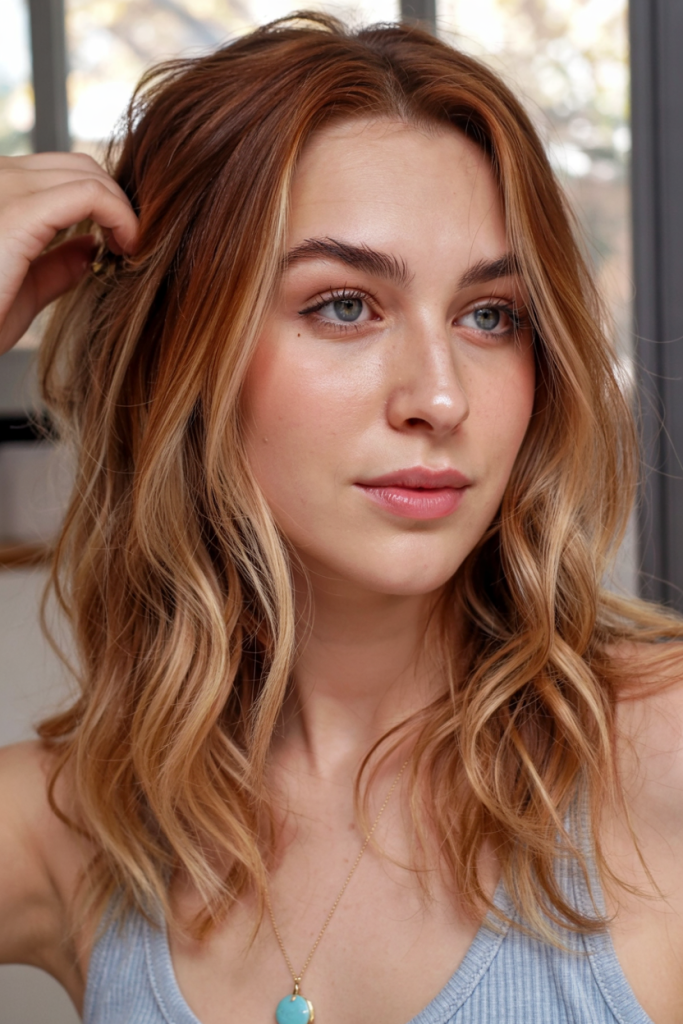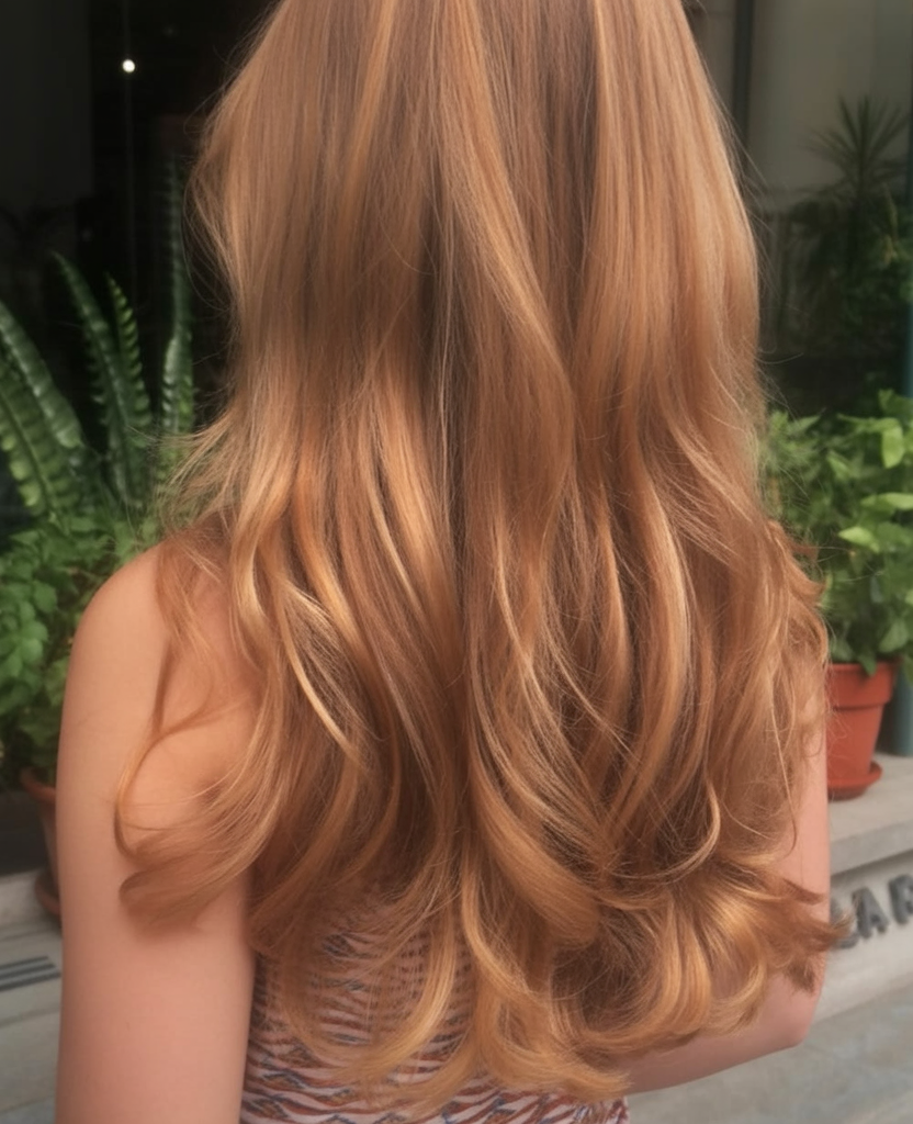 This strawberry blonde with sunstreaks of gold is made to give the best of both worlds: utter glow and coziness, leaving your skin appearance instantly looking brighter and fresher. The flowy, full, waves exude that wind in your hair, seaside vacation vibe- it is easygoing, but clearly fun and fashionable. It is like summer in a bottle of your hairstyle with the light hitting each strand.