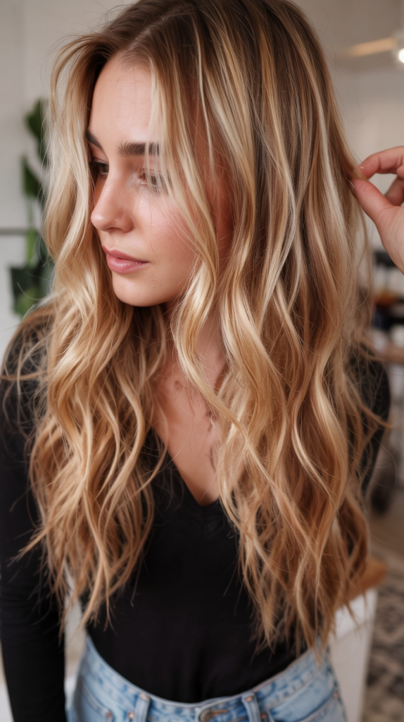 This dimensional lived in strawberry blonde combines golden highlights and darker lowlights producing a deep, multi-tons of hair. The waves are loose and inviting and regrowth is easy with the shadow root. Its a feel good color that is fresh but at the same time elevated as though you just returned home after a sunny vacation.