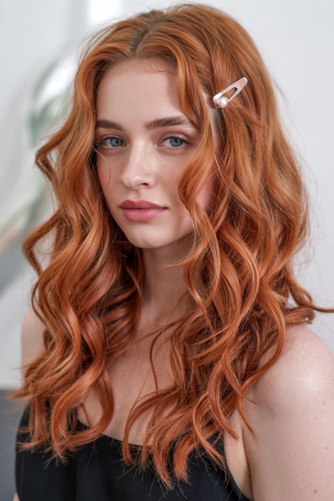 This refined copper-haired strawberry blonde has a lot of life and shine in her with some well-structured curls that light up so perfectly. It features a simple pearl-trimmed hair clip, so it is an ideal mix between utility and form, which can be worn every day as well as on a special occasion.