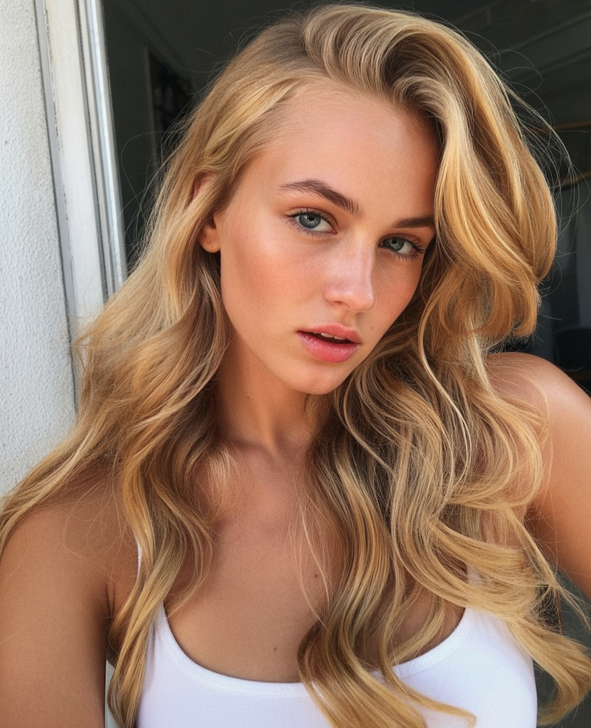 It is relaxed golden strawberry blond, airy, romantic and with lots of volume. The waves are denoted by soft beachy sweep, which allows to demonstrate the warm golden tones, just as the lighter accentuates follow the light perfectly. It is a young, but classic style, which is universal in all seasons.
