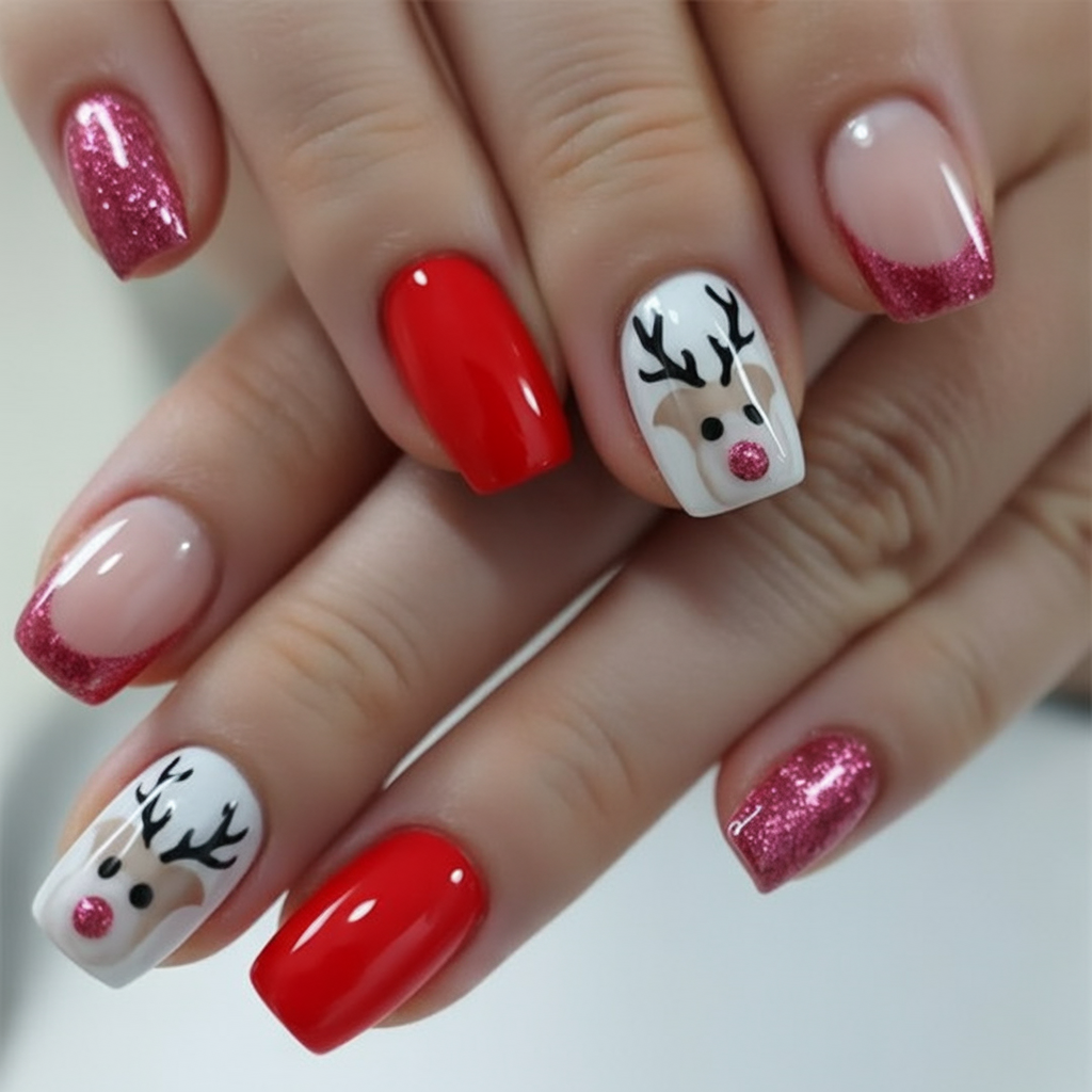 These nails bring a touch of holiday cheer with playful reindeer art on a crisp white base, paired with pink candy-cane stripes and snowy snowflakes. The glittery pink accents make the whole set sparkle, while the character design adds an adorable twist. It’s a lighthearted, festive manicure that captures the fun side of Christmas.