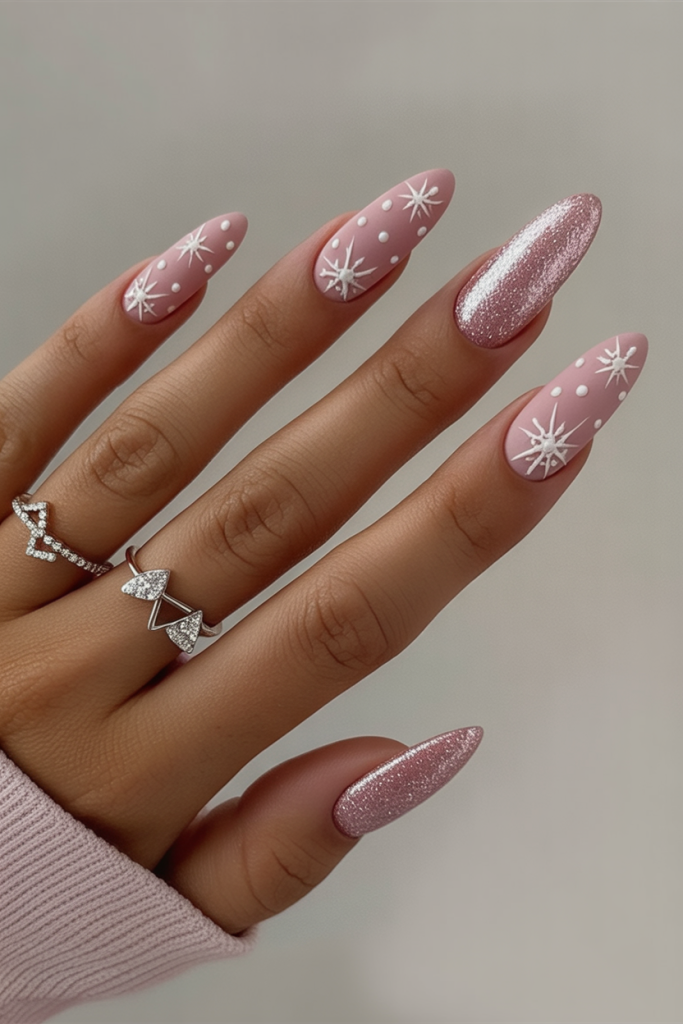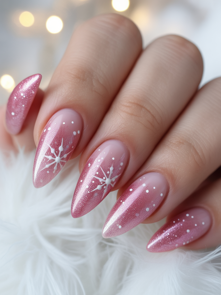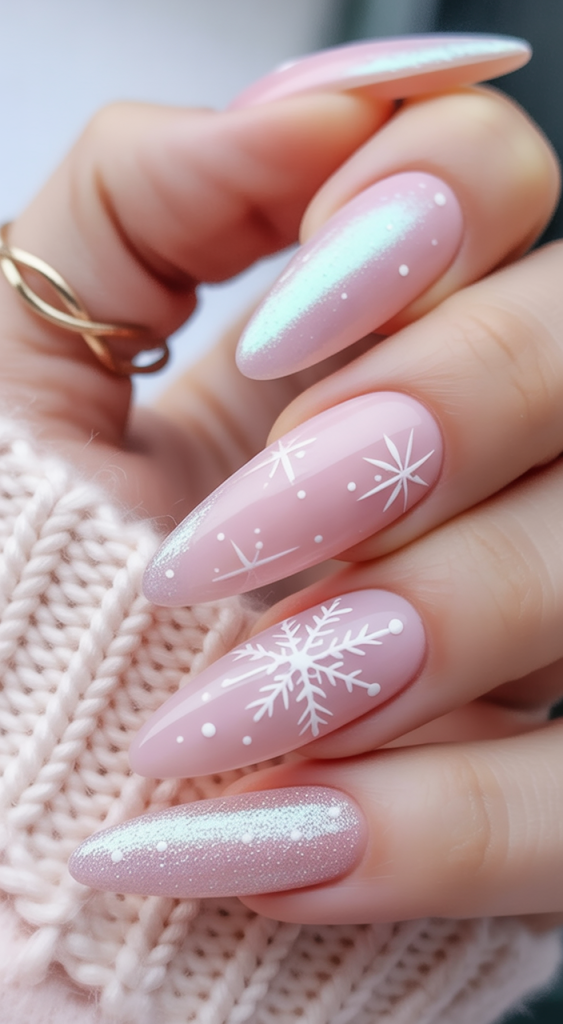 17. Shimmery Pink Almond Nails with Snowy Stars