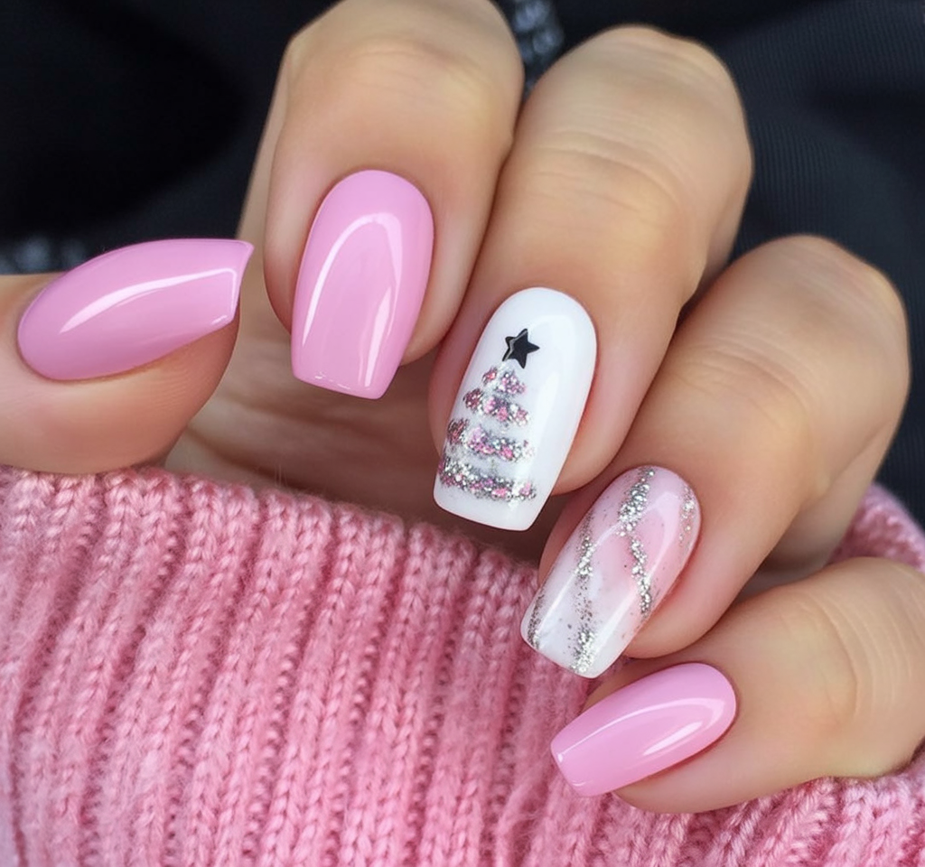 Cheerful and fun, these pink nails bring a little bit of Christmas tree sparkle right to your fingertips. A white accent nail decorated with a glittery pink tree stands out against the glossy pink and silver stripe details. It’s bright, festive, and perfect for anyone who loves playful designs that still look polished.