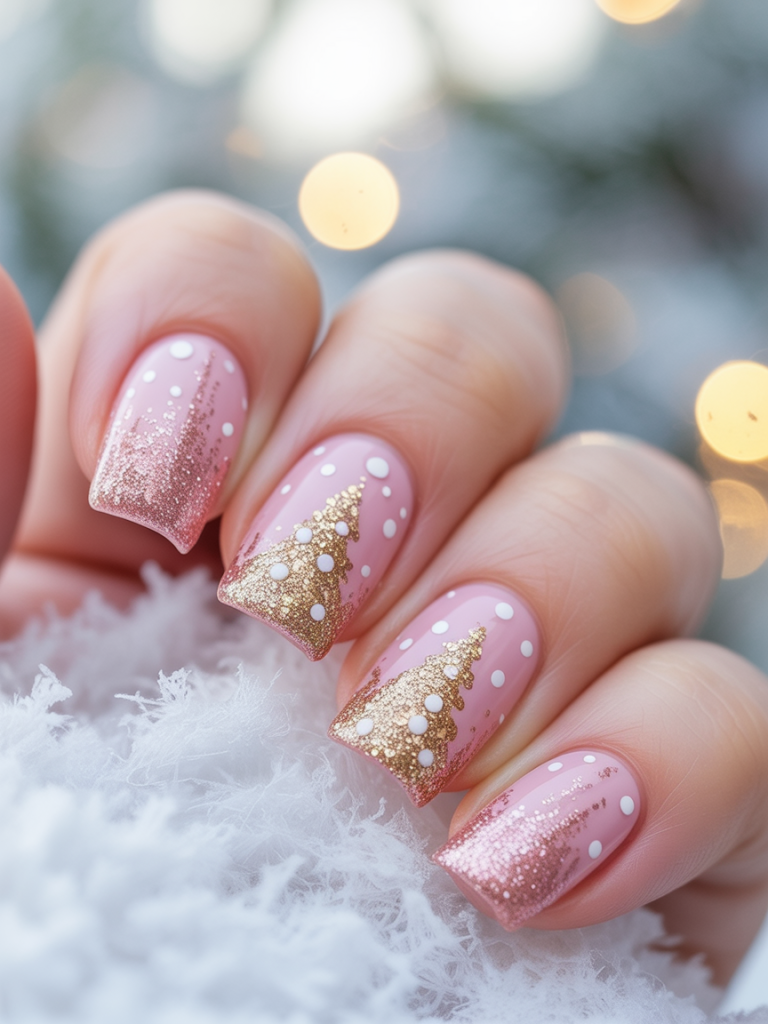 These pink Christmas nails sparkle with magic, thanks to the golden glitter trees that seem to glow against the light pink base. The addition of playful white dots creates a snowy effect, making the whole set look like a winter wonderland in miniature. They’re joyful, festive, and perfect for anyone who loves a bit of holiday glam.