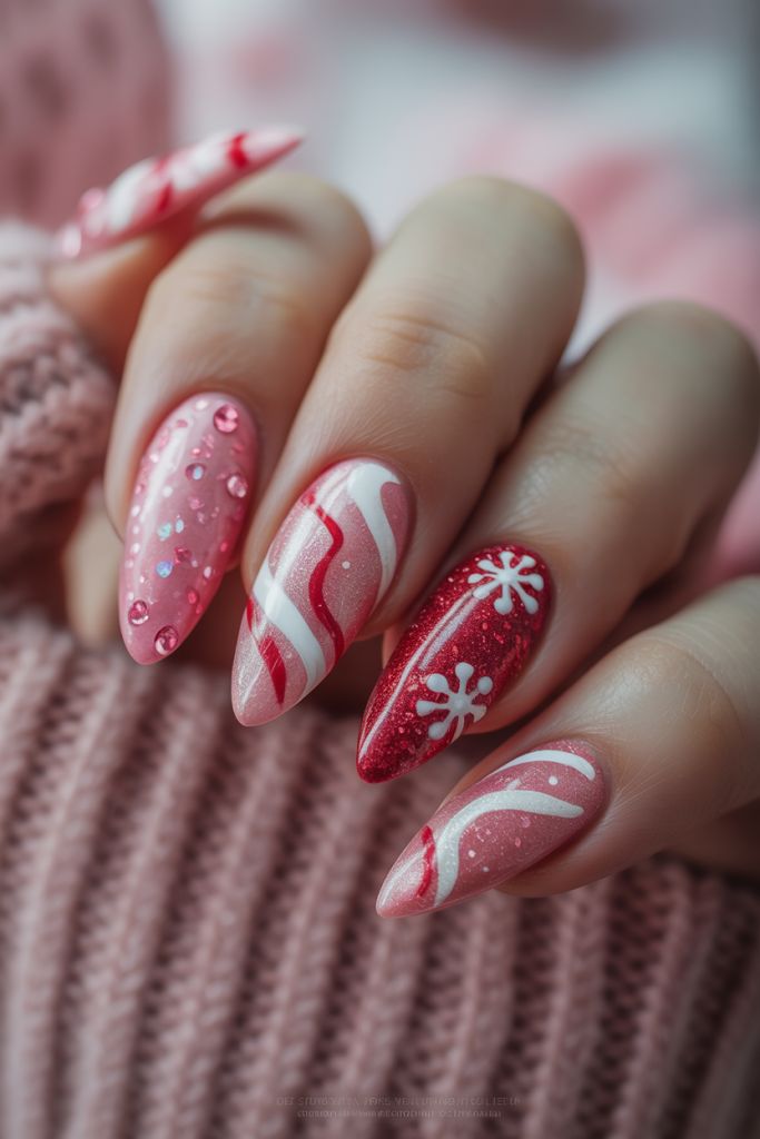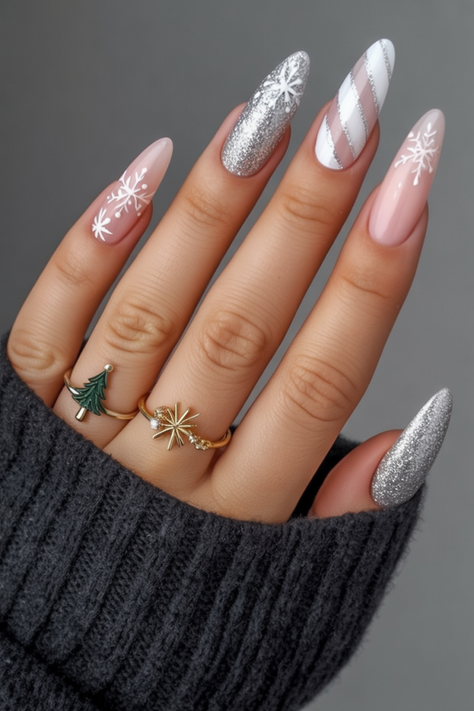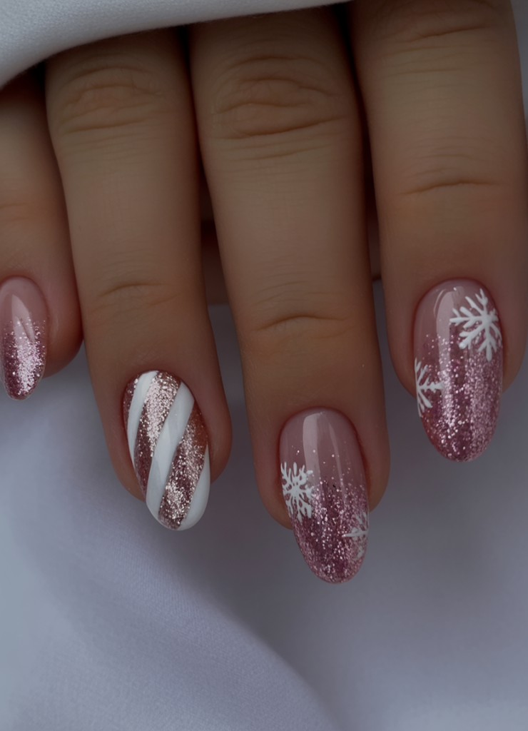 There’s something breathtaking about this pink and silver set — glittering tips paired with delicate white snowflakes, all on a blush-toned base. The diagonal stripes give it a candy cane twist, while the shimmer ties the whole design together in a bright, elegant way. It’s the perfect blend of traditional holiday art with a modern twist.