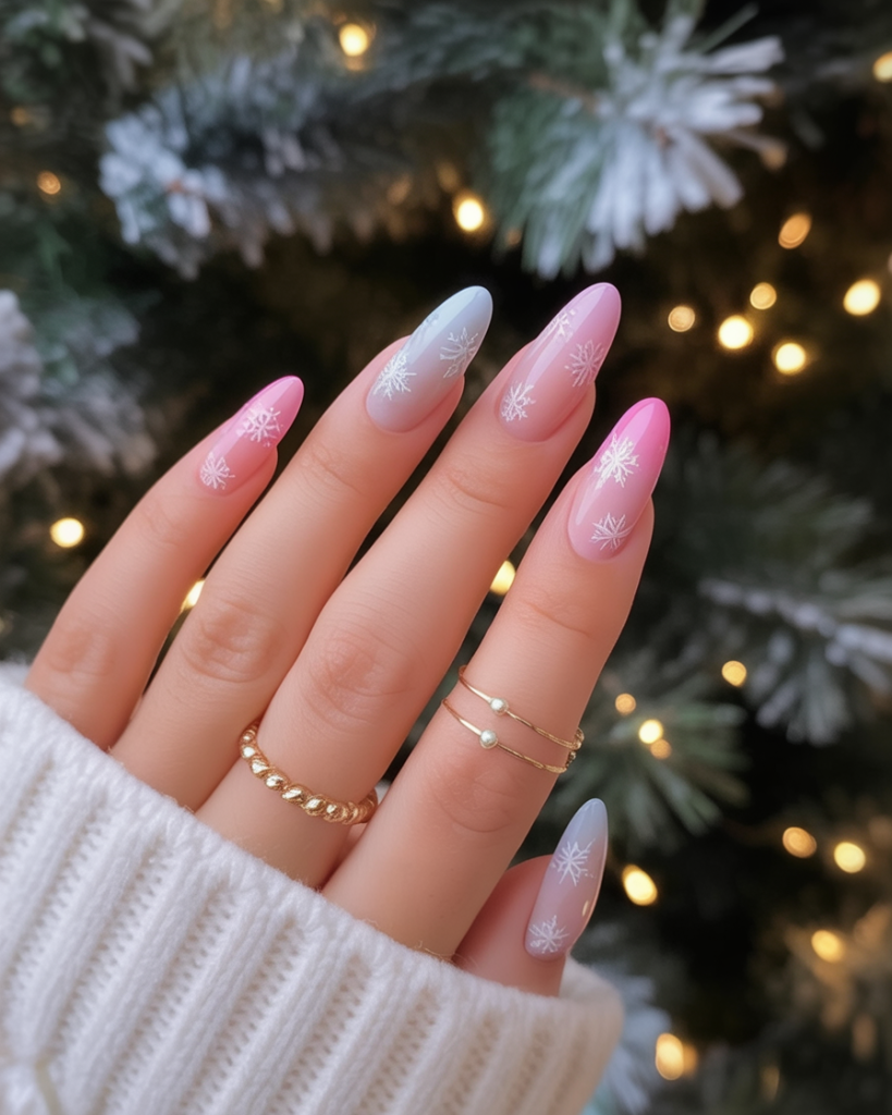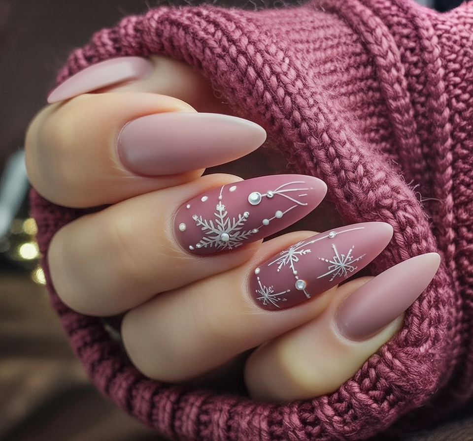 These pink almond nails feel like looking up at a frosty December night sky sprinkled with glittering stars. The soft matte pink base makes the white star-like snowflakes pop beautifully, while the shimmer on alternating nails adds just enough sparkle to capture the holiday glow. It’s festive but chic, the kind of design that makes you want to wrap yourself in a cozy scarf and enjoy the season.