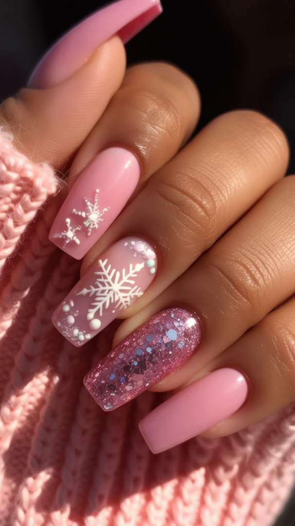 This design should ideally fit the long long-square nails so it allows bold art and glitter to shine brilliantly. Chunky pink sparkle makes it playful while snowflakes made sure the party stayed festive. It’s a confident, cute look whose very presence makes a manicure with which to star in any party.