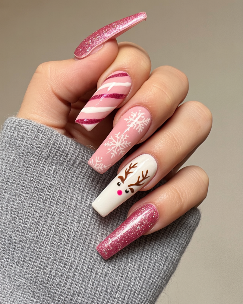 This style looks best on long coffin nails where the detailed art can be fully appreciated. It’s great for anyone who enjoys holiday nail ideas that lean cute and whimsical. With its mix of pink glitter and holiday icons, this design feels like a celebration at your fingertips.