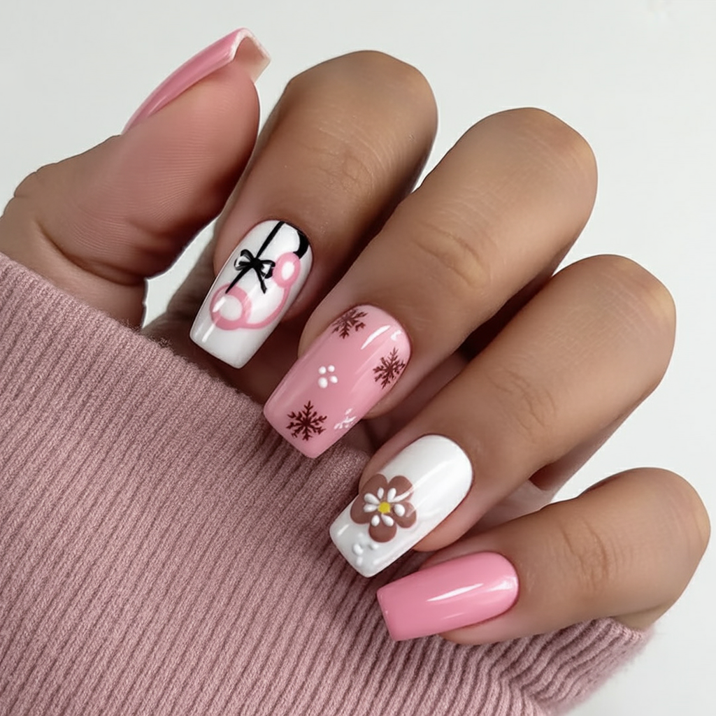 The pink Christmas mani is full of adorable charm, with a wrapped-gift accent nail sporting a bow, delicate snowflake designs, and a cute flower design. The mixture of pink and white keeps everything light and girly, and the little details give it a festive personality. This is a lively, creative interpretation of holiday nails that feels light and fresh.