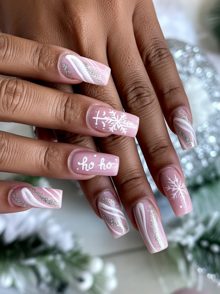 In case you are the one humming along to Christmas tunes while baking gingerbread, these square pink Christmas nails have practically been made for you. That playful “ho ho” script paired with candy cane stripes would seem to be the surrealists’ honorific silver glitter genuinely illuminating an unmistakable holiday spirit. Each detail seems to be an artful wink to Christmas traditions while keeping it light and contemporary.