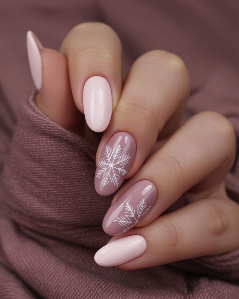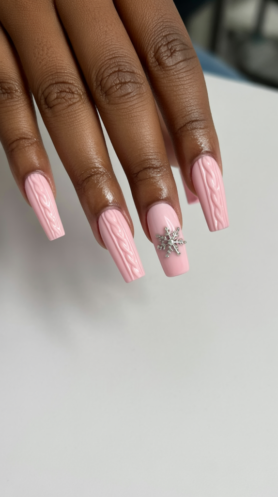 22. Soft Pink Sweater Nails with Snowflake Detail