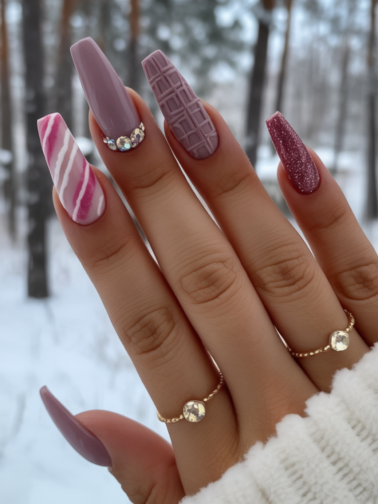 This manicure is all about texture mixing for an elegant-yet-playful holiday vibe. With a mauve matte nail embossed with sweater-like detailing, sparkling pink glitter, and candy stripe art, the set screams luxury and creativity. The rhinestone accent glam it up for winter festivities.
