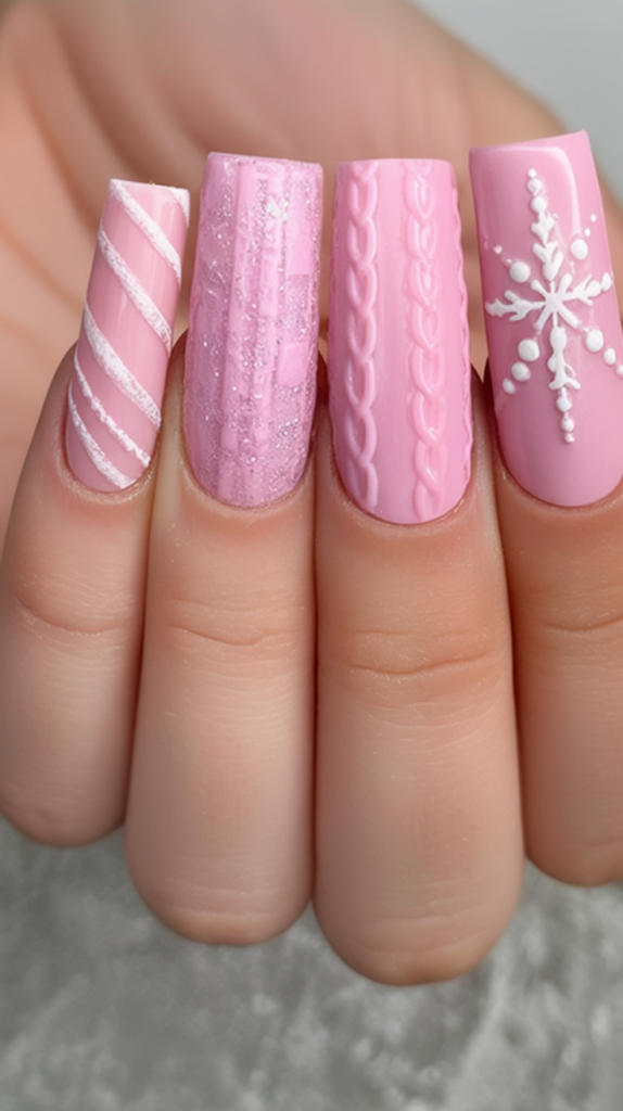 5. Sweater-Inspired Pink Christmas Nails with Charm