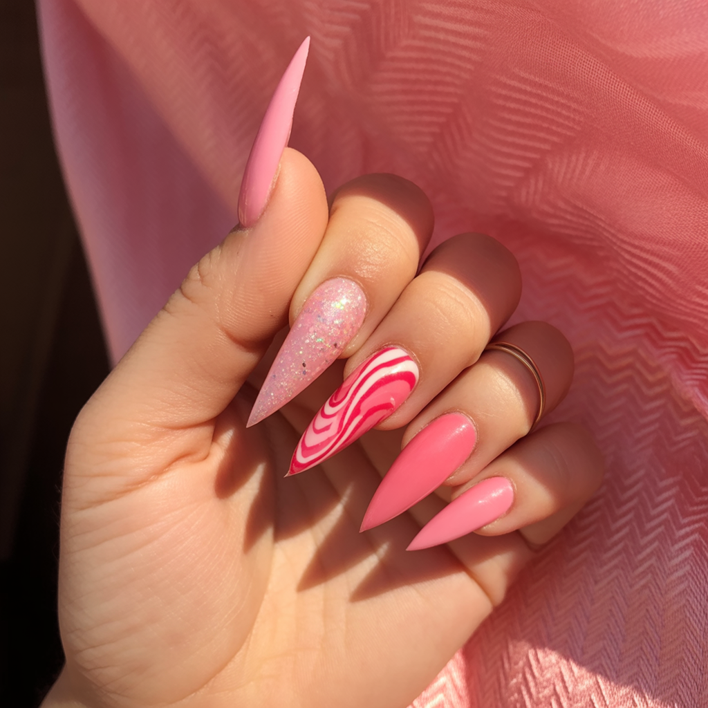 Loud, loud, and full of personality, these bright pink nails declare holiday cheer with swirling designs and a glitter accent. The sharp stiletto shape gives it an edgy feel, while the carefree art-life mix keeps it light and fun. It`s a bold way to make pink nails for Christmas feel bold and fresh.