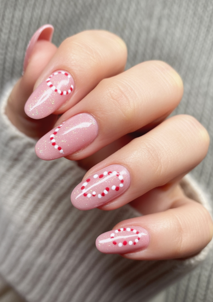 Pink sparkling nails dressed with dotted bead art in red and white speak holiday candy! The delicate design feels whimsical and charming, perfect for someone who enjoys the playful side of holiday nails. It is soft, cute, and bursting with seasonal personality.