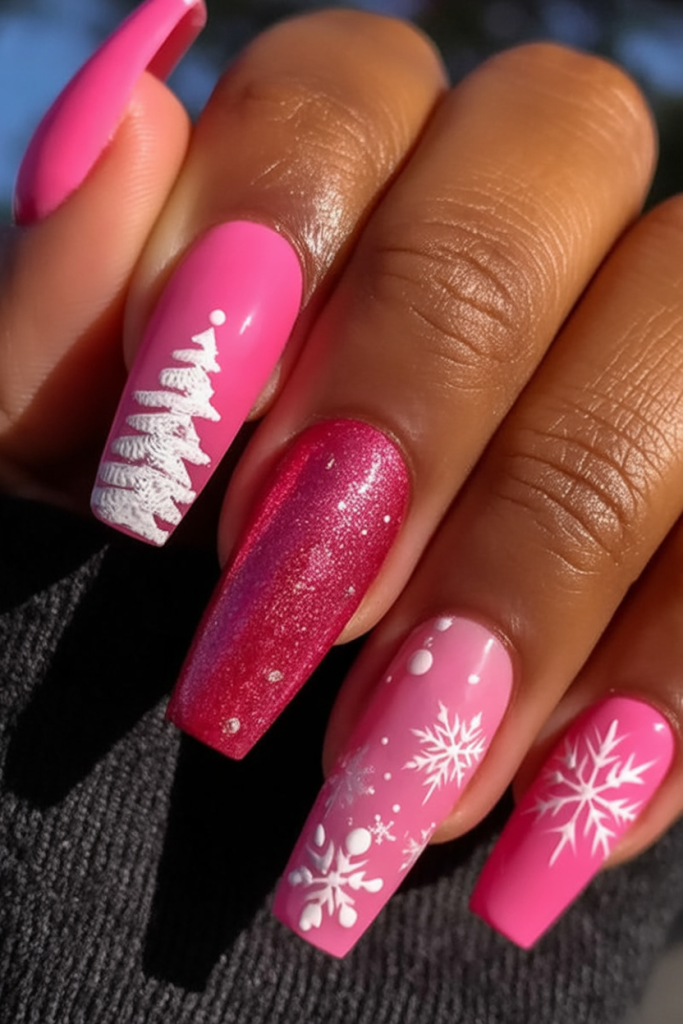 3. Bold Hot Pink Nails with Snowflakes and Trees