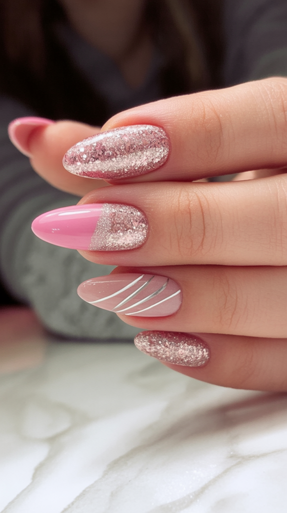 Pink Christmas nails get a new upgrade here — glitter layers melting into a rosy base, capped with simple white stripe art. Glamorous without overbearing, these nails catch the light with every move, emanating a rose gold sparkle. All-around fun, chic, and festive for anyone who likes design with minimal fuss.