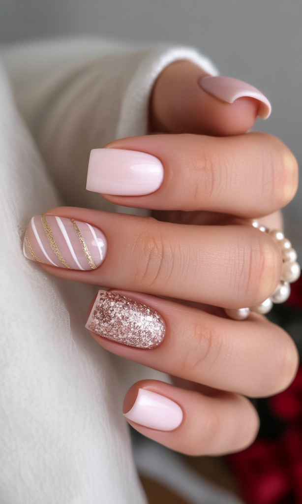These short square nails are a wonderful pick for women who like practicality without losing out on style. The subtle glitter and stripes keep it versatile for work, family gatherings, or a night out. It’s an easy design that proves pink Christmas nails can be both classy and cute.