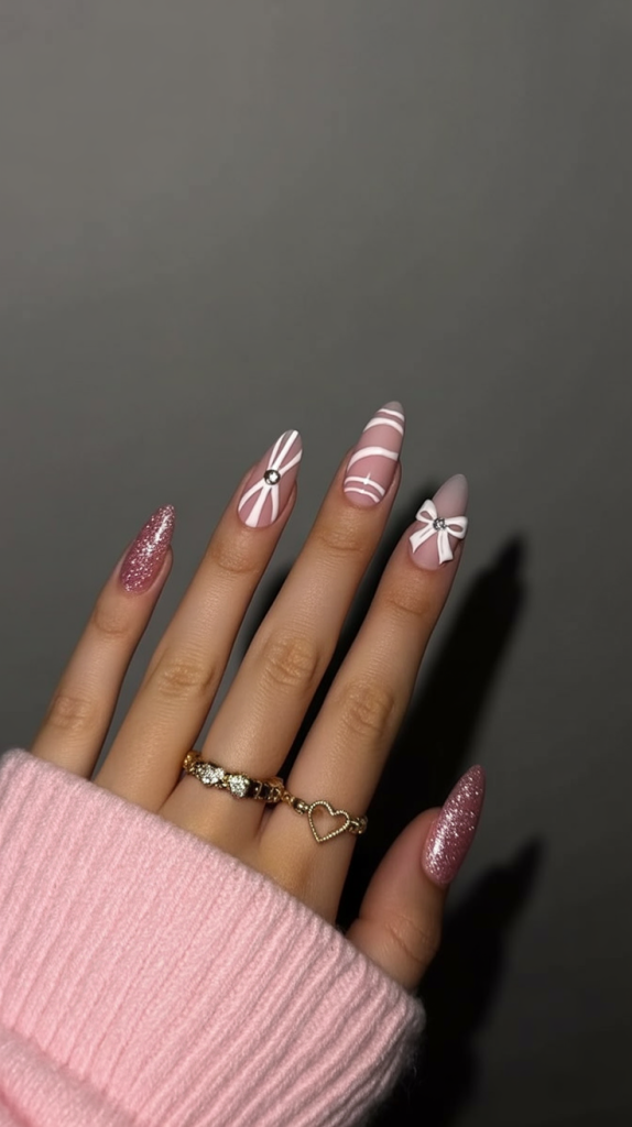 9. Pink Christmas Nails with Ribbon Bow Accents