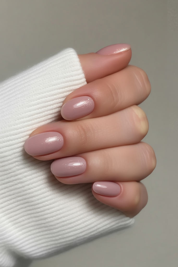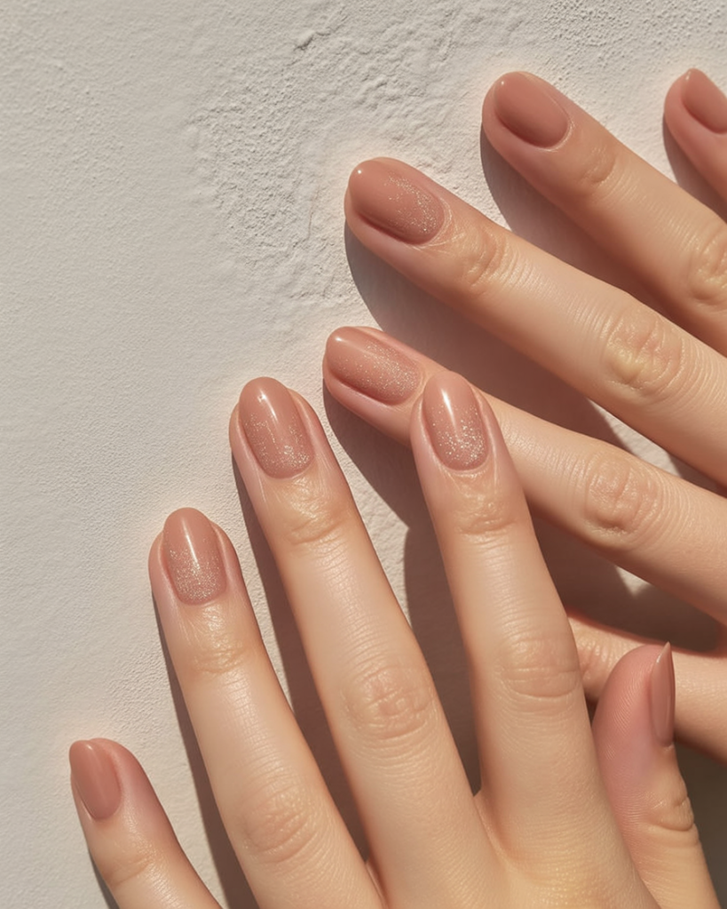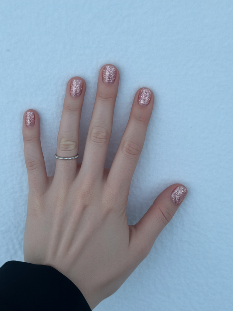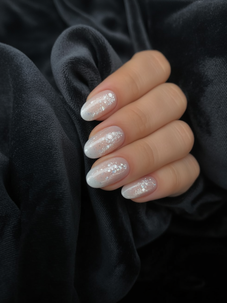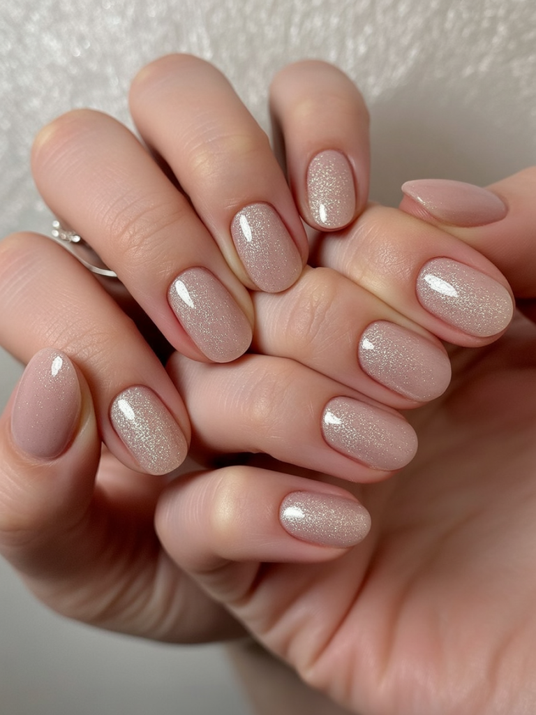 These nails shine with an understated elegance thanks to a nude base topped with a soft shimmer. The delicate sparkle feels like frosted glass, subtle but incredibly chic. It’s a timeless design that adds just enough glow for winter evenings while still staying beautifully neutral.