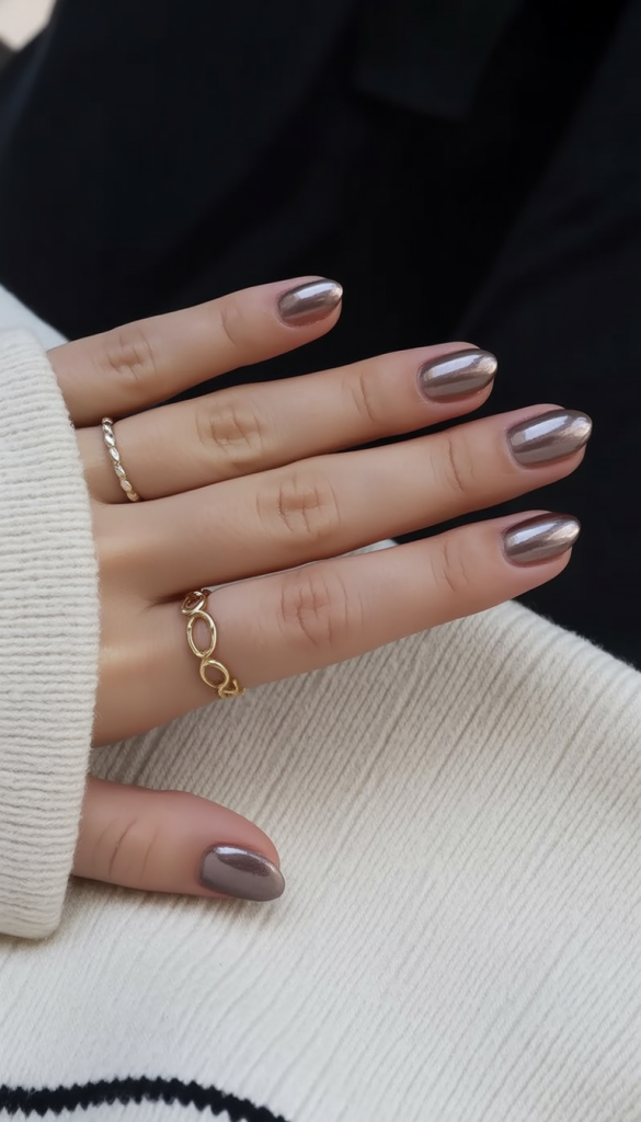 Bold but wearable, these metallic taupe nails have a modern edge that feels instantly chic. The sleek reflective finish adds a trendy twist, while the short almond shape keeps them practical. They strike the perfect balance between edgy and classy, making them a standout winter design.