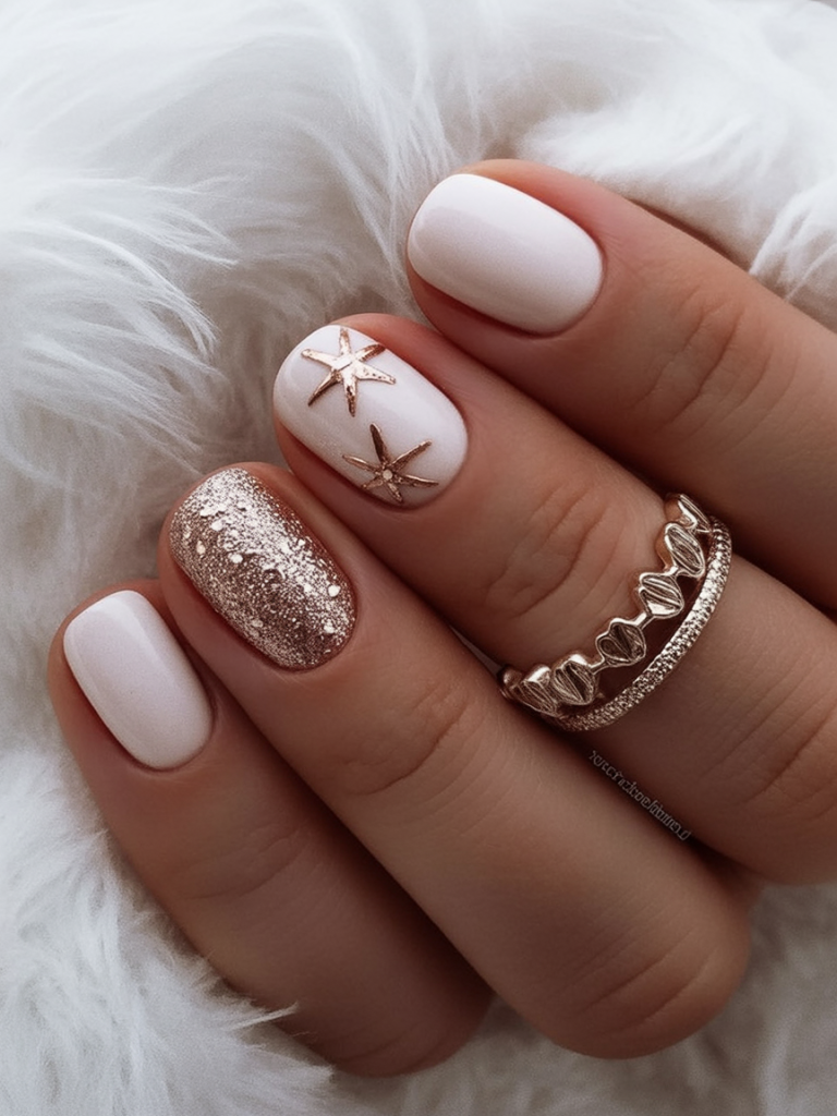 What makes this set unique is how it combines art and texture without being overwhelming. The mix of matte white, gold shimmer, and glitter gives it a fun layered effect. If you’re searching for cute holiday inspo that stands out in photos, this one is an easy win.