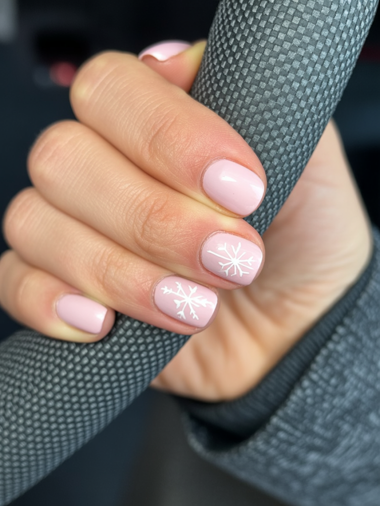Soft pink nails with delicate white snowflakes instantly bring a playful, cozy charm to winter. The pastel base feels cute and feminine, while the snowflake art adds that festive detail without being overwhelming. It’s a cheerful design that feels perfect for both everyday wear and Christmas celebrations.