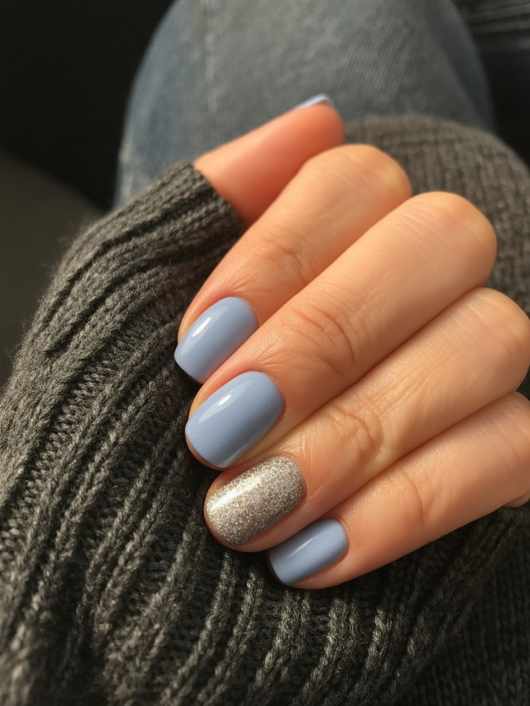 Winter blues never looked so good—this manicure pairs soft blue nails with a sparkling silver accent, giving your fingertips a playful frosty vibe. It’s a fun twist on seasonal designs, with just enough shimmer to feel festive without being too bold.