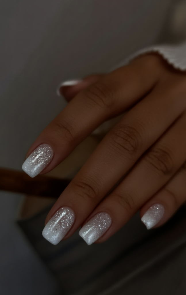 These nails feel like a gentle snowfall captured on your fingertips. The soft white ombre fades into a translucent base, while delicate glitter accents give the illusion of snowflakes sparkling under winter lights. It’s a dreamy design that makes you think of crisp mornings and cozy scarves, all wrapped into one.
