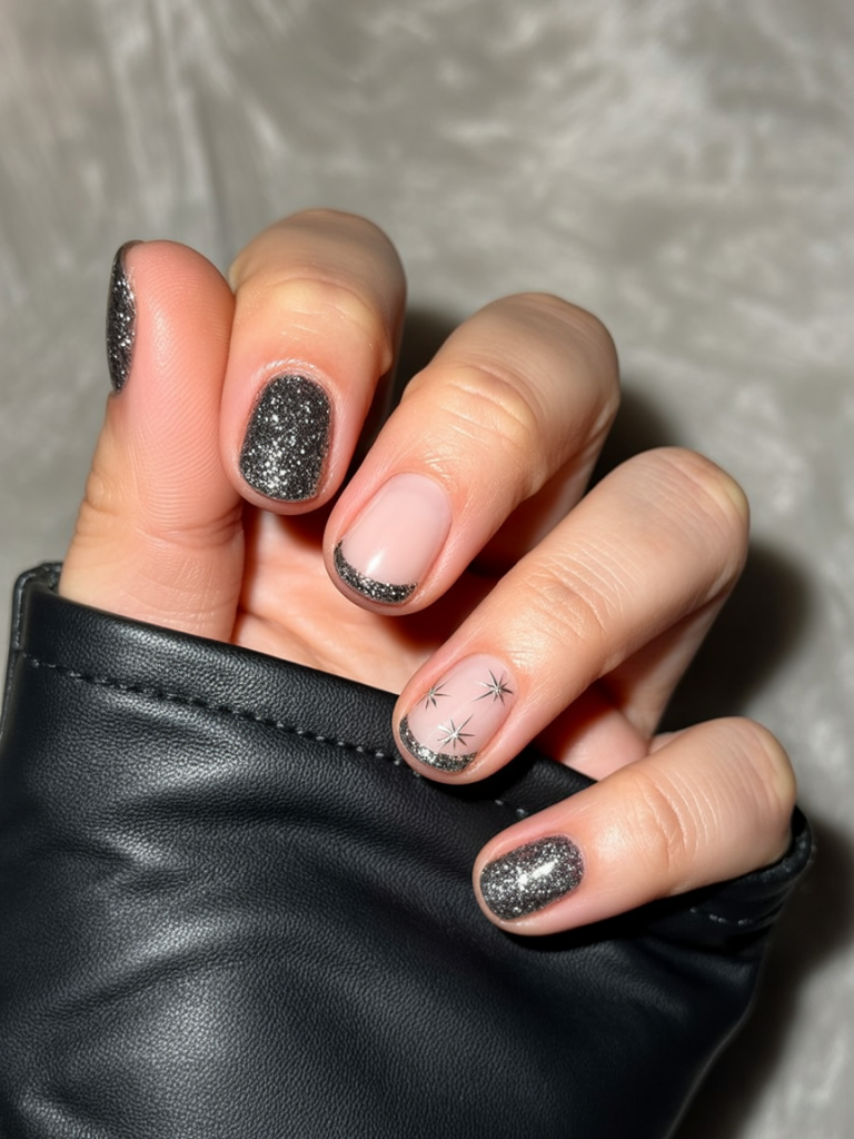 For a bold winter statement, these black glitter nails bring all the sparkle of a starry night. With shimmering accents and tiny star details, the design feels festive and daring without losing its elegance. It’s playful, dramatic, and perfect for parties or special evenings out.