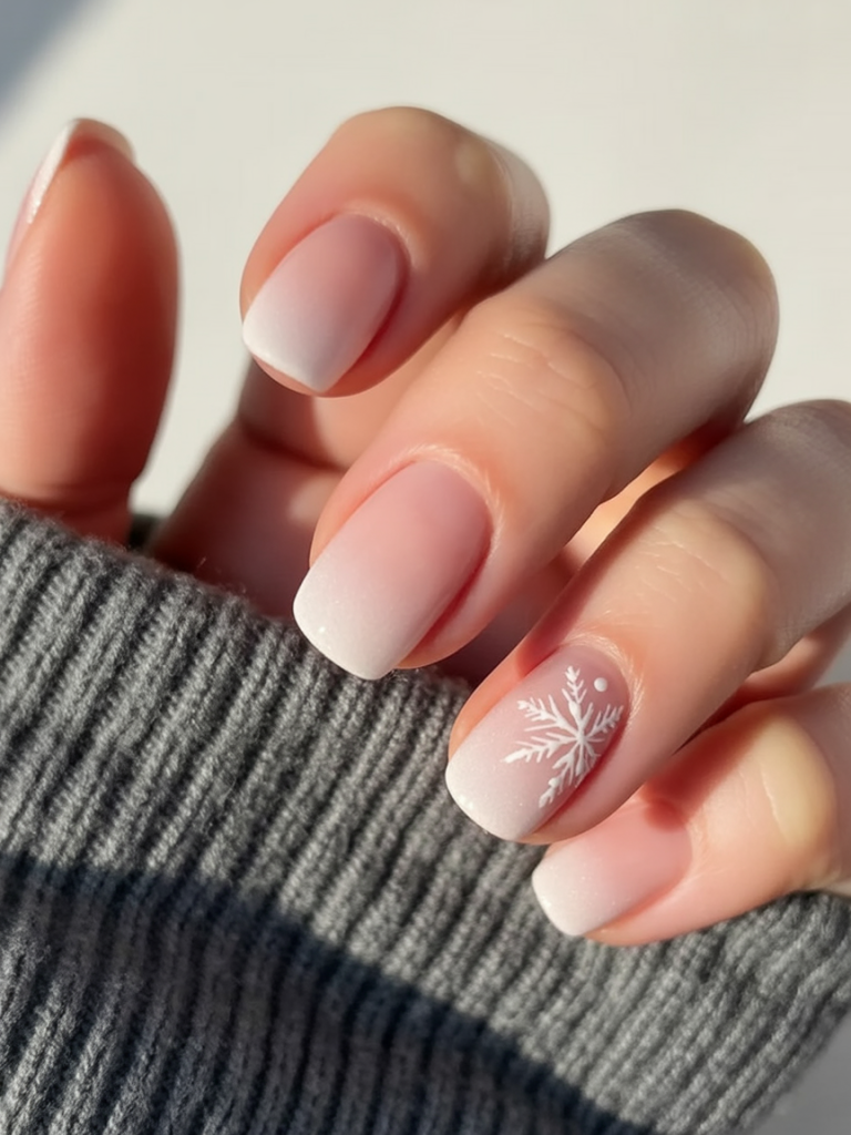 These nails capture the quiet beauty of a snowy morning. The soft matte ombre base paired with a delicate snowflake design instantly feels like winter magic. It’s a cute nod to the season while still looking polished and sophisticated, making it an ideal choice for cozy holiday moments or casual everyday wear.