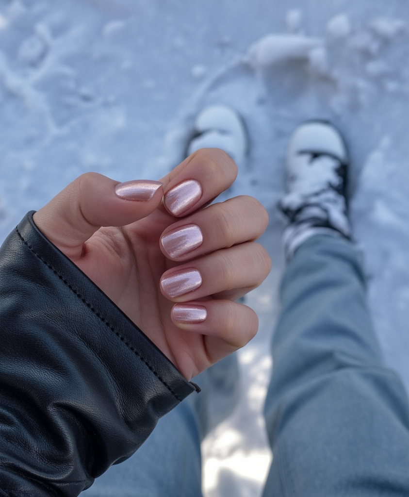 These nails glow with a soft pearl sheen, creating a chic and feminine look. The reflective finish feels modern yet timeless, bringing just enough shimmer to catch the light without overwhelming the design. It’s a subtle nod to frosty mornings and sparkling snow.