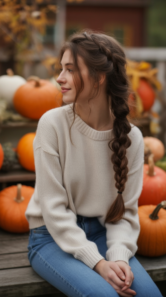 The fuzziness and the cuddliness of this side braid is so happening; this hairstyle becomes a lump of wool jersey and a warm cup of spiced cider. The curvy tendrils around the face give it the softness in all the right way of Thanksgiving, they famously bring in the crisp of the fall, yet with a delicate, earthy touch. Whether you’re heading to a family gathering or strolling through a pumpkin patch, this look speaks to the calm, reflective moments of the season.