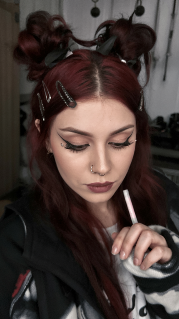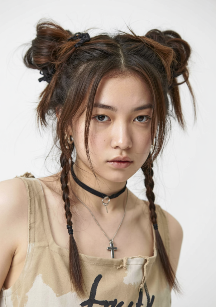 This childish but creepy aesthetic is providing contemporary vampire schoolgirl vibes. The twin space buns add the cute messiness to it whereas, the two long braids and strands around the face keep it classy and messy. It’s the kind of look that feels rebellious but still totally intentional — like you’re sweet, but only until sunset.