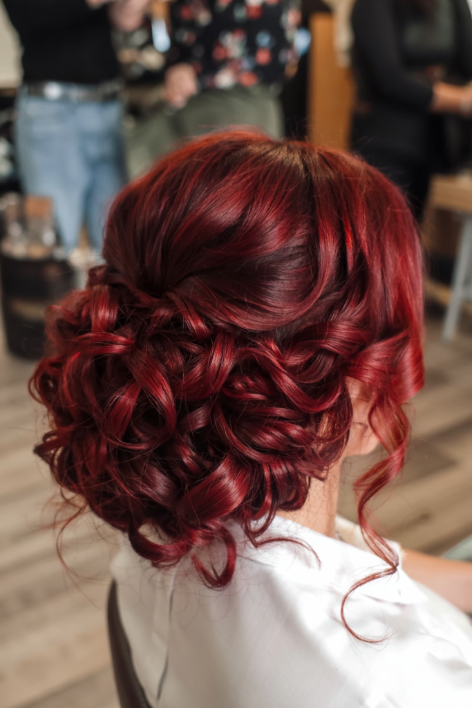10. Crimson Vintage Updo with Glossy Curls