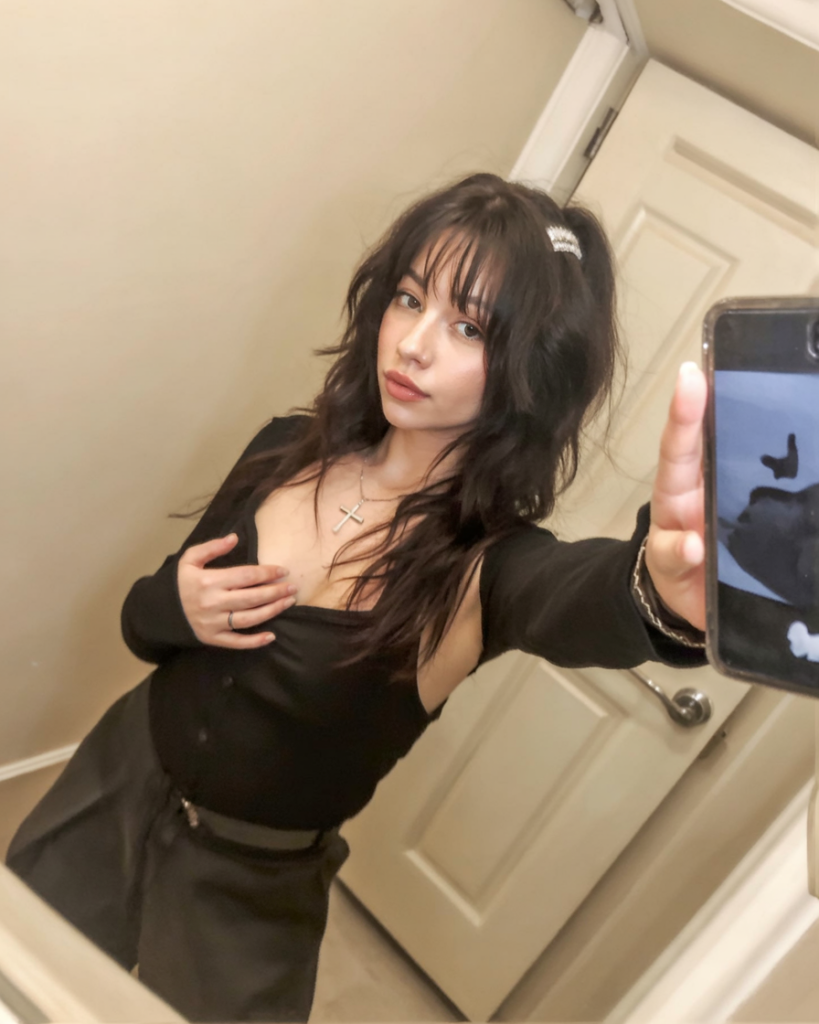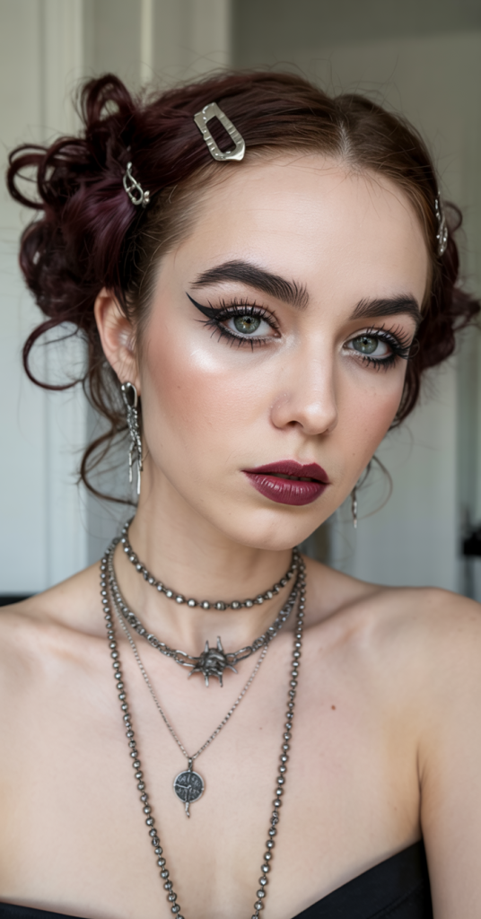 This outfit has some old-fashioned enchantment: A vampire flapper who starred in the 1920s and has reincarnated in 2025. It has the soft edged curls and some non existent baby bangs, making this style vintage and whimsical. It is very innocent and very dangerous at the same time – the sort of style that works really well in the candlelight and the reflections-free hallways.