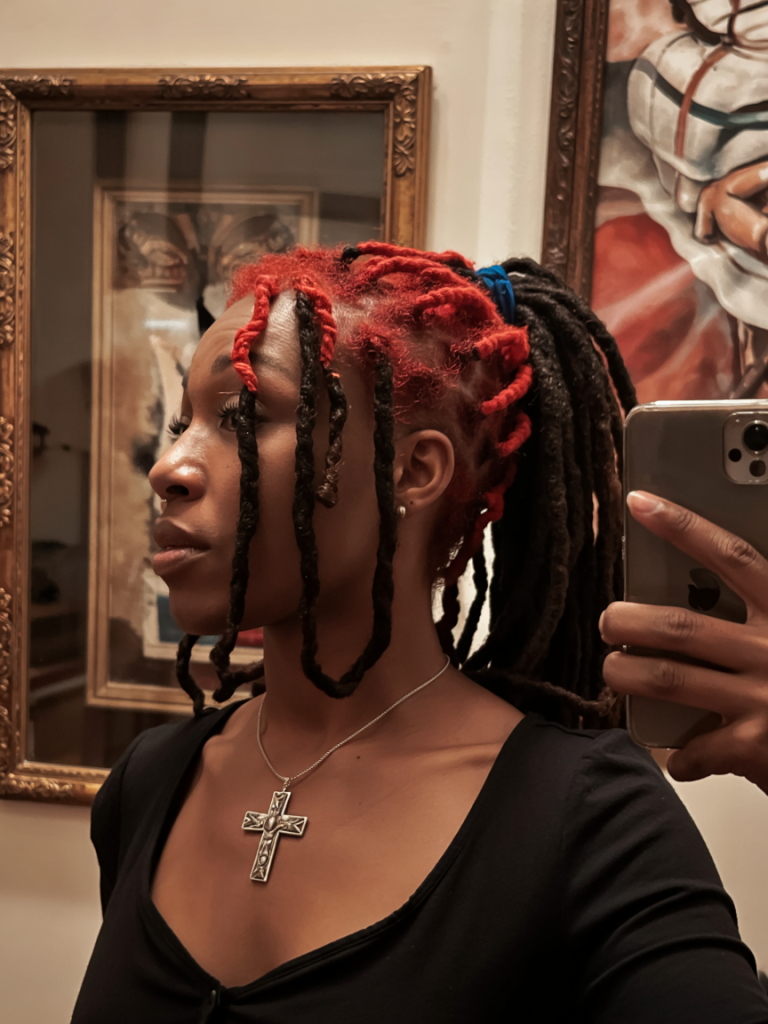 And there is something regal about this high ponytail dyed in the colors of the red and black locs. It gives the impression of a present-day vampire queen who is daring, unreachable, enigmatic. The red is like power and danger but the black mollifies it with haunting grace. It attracts attention and holds it, when worn with statement jewelry.
