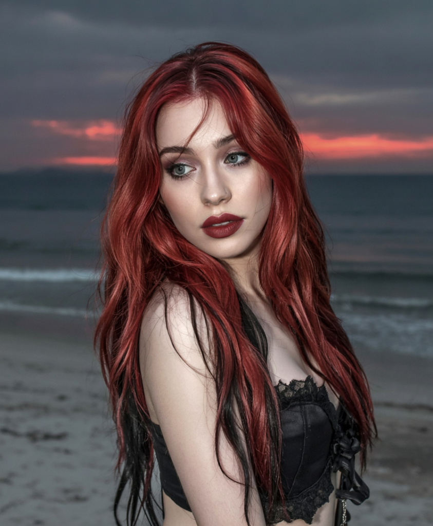 This layers hairstyle is more of a vampire siren coming up the sea at dusk. The long hair is flowing freely and the combination of crimson and black is simply edged as dangerous and completely seductive. It looks like it was born to hit the beach and be surrounded by the moonlight, and is heavily gothic.