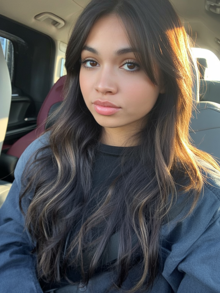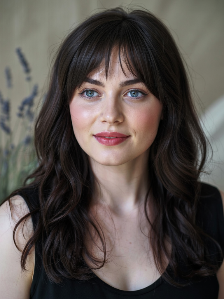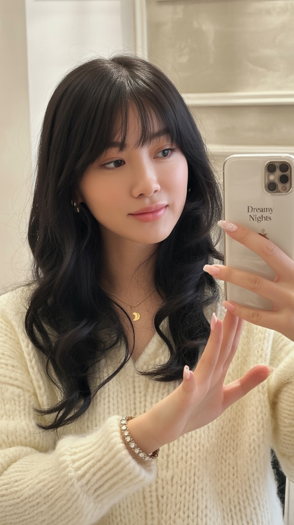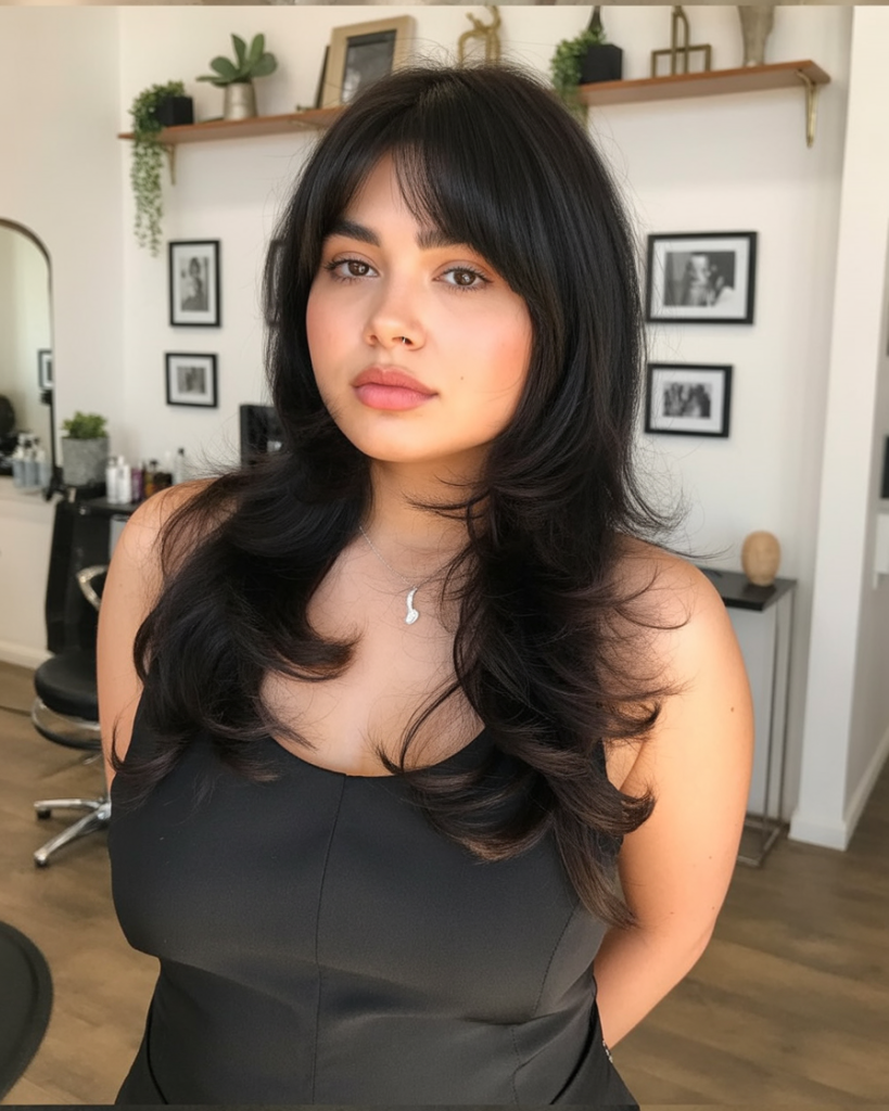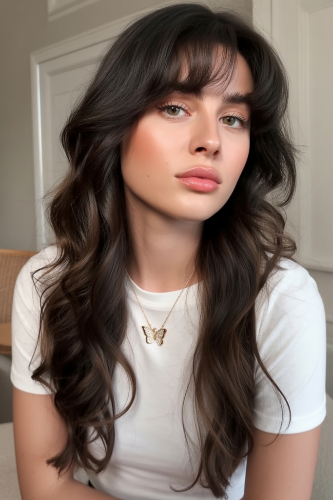 A beautiful long butterfly haircut is soft with curtain bangs that open the face in the right proportion to make the face look balanced. That feminine, easygoing feel created by the cascading waves is romantic and yet modern, almost like that style you might put on a weekend trip or a close to home date.