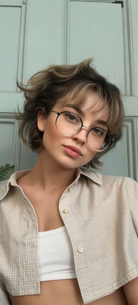 Wispy and whimsical, this casual short bob haircut and bangs is fun and young. The disorderly look provides fullness and enthusiasm, and the bangs introduce gentleness to circular face. The glasses give it a designer flair so that it is bookish but very fashionable.