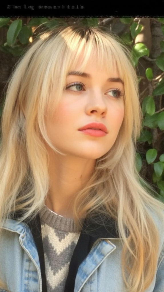 It is shoulder length shagging with wispy bangs with a hint of magic, pure 2025 trends; layered, airy and movement. Being light and trendy, the soft texture makes it not too serious, and a bit of edge provided by the bangs does not make it boring. Adding to the lighthearted, youthful fun of the Moppy haircut is the warm wispy blonde colour.
