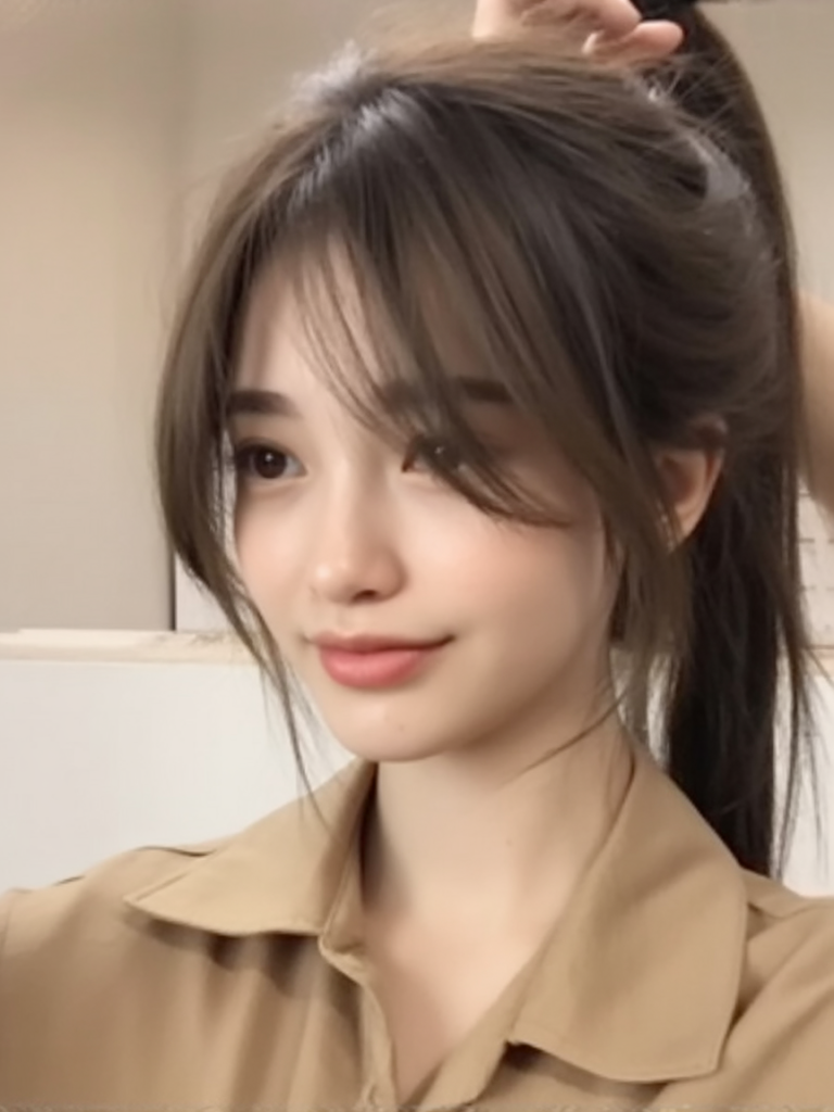 A high ponytail immediately makes the face look higher and when it has wispy curtain bangs then it makes it quite youthful and lively. The bangs lightly fall on the cheeks to balance the lifted bun of the ponytail.