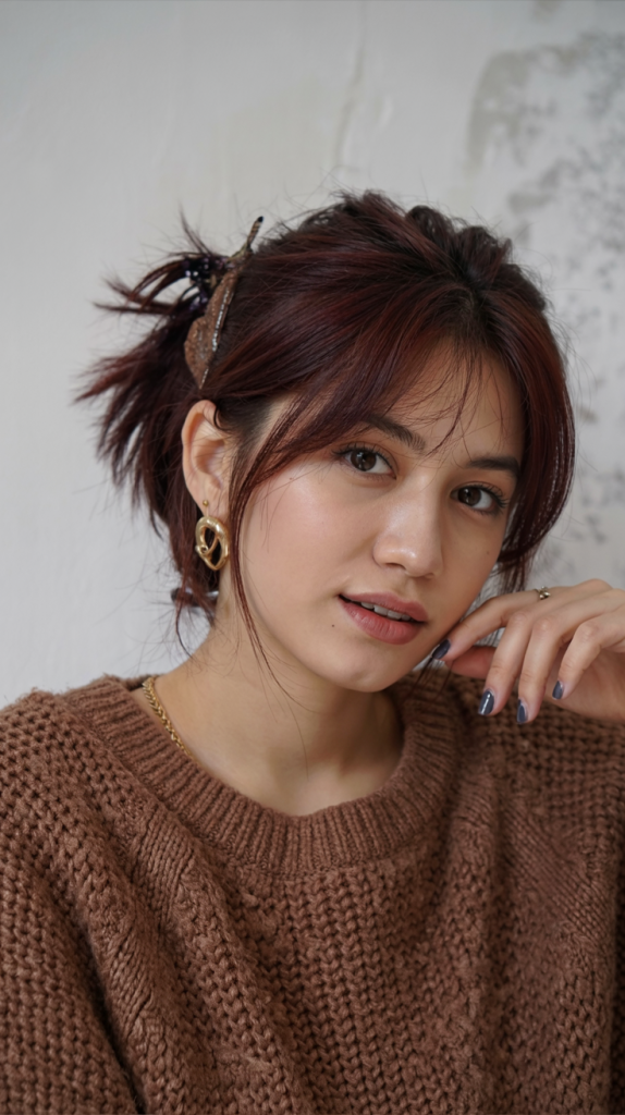 There is something playful about this short hair with curtain bangs but when you add some texture and put it in a casual updo you get something sweet. The fringe cuts through the roundness of the face and the pulled-back look brings out the cheekbones and the jawline. The ensemble is contemporary and classic at the same time modern and classic especially when matched with gold statement earrings which makes the look a bit artsy and a bit polished.