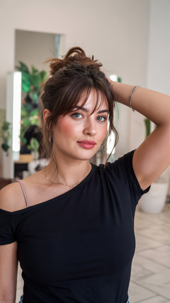 It is an ideal appearance when you prefer to avoid overcomplicated styling however, you do not want to look accidental. It is applied to straight hair, curvy hair or even a little curly hair. No need to even try to style it too complex: just braid it up in a bun, leave out a couple of strands to make it softer, and let the bangs do the rest; the less effort made, the better effect gives it.