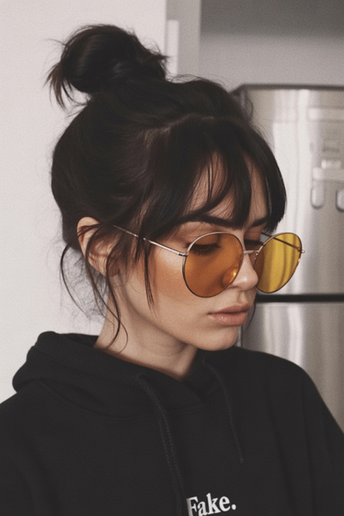 Undone top knot and wispy curtain bangs make an ideal street-style. It looks cool but is not too flashy, and the feathered hair that is placed at the foreseen location gives it a flattering shape on a round face. The small floral twigs that fall around the cheeks give the entire vibe that would seem easy and stylish at the same time.