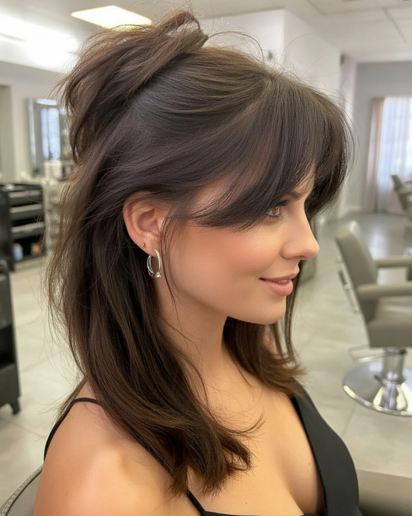 The best part about this half-up hairstyle is that it is the best of both worlds; the enthusiasm and elevation of an updo and the softness of long layers that frame the face and curtain bangs. The outcome is new, feminine and ideal to display earrings or a small necklace.