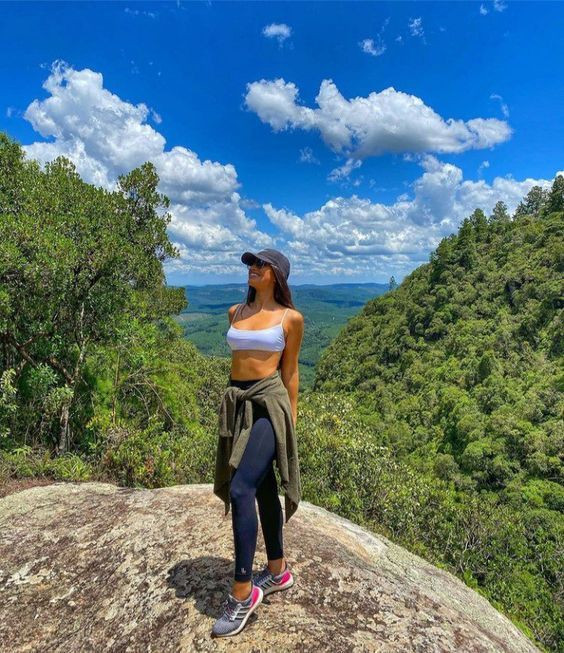 A casual yet practical outfit, this look combines a cute sports bra with high-waisted leggings to provide the perfect balance of flexibility and breathability. The lightweight cardigan tied around the waist adds a stylish touch while being handy for sudden temperature drops. A hat is essential to protect your face from the sun, and comfortable sneakers ensure a firm grip on the trail. Perfect for women who want an effortless aesthetic while enjoying nature. Opt for moisture-wicking fabrics to keep sweat at bay and choose leggings with pockets to store small essentials like your phone or keys.